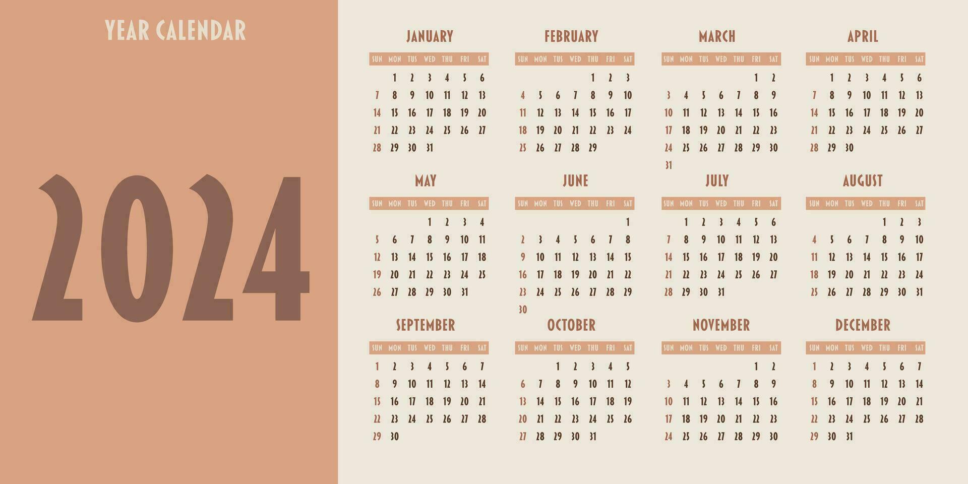 Calendar 2024 year. Week starts on Sunday. Design for planner